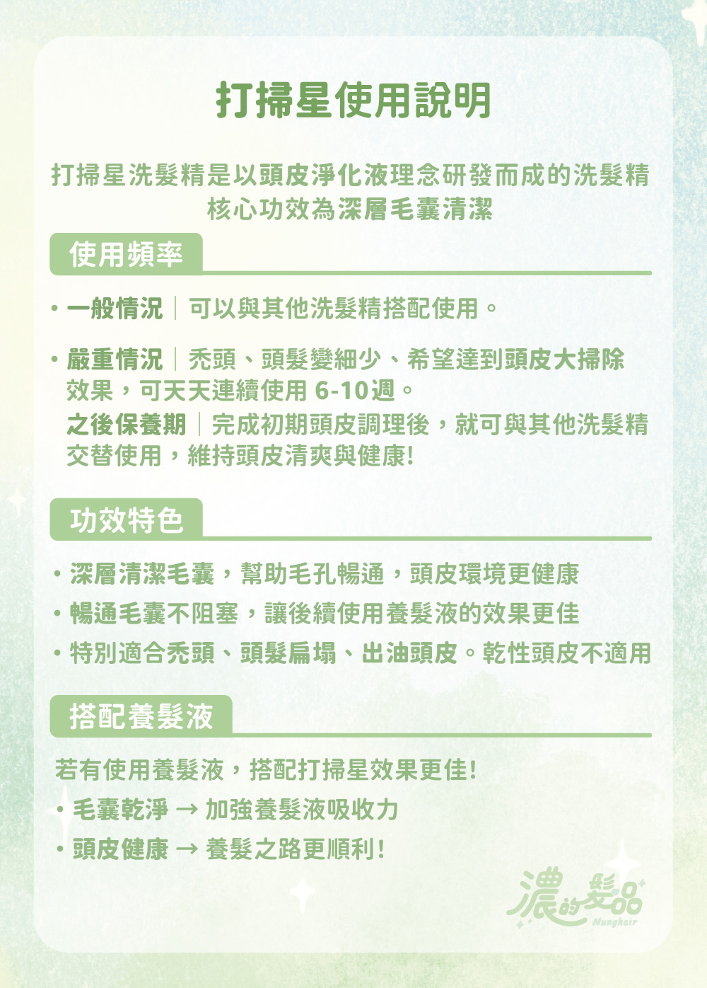 打掃星 頭皮淨化洗髮精專為油性頭皮、髮根塌陷、掉髮困擾 設計的頭皮淨化洗髮精。